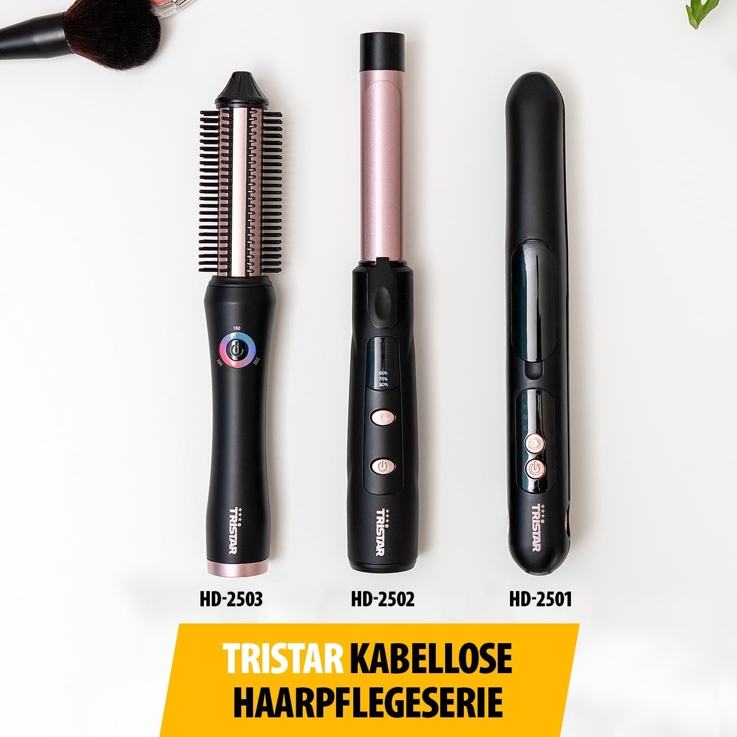 Perie de styling fără fir Tristar HD-2503 cu 3 trepte de temperatură, înveliș ceramic și autonomie de 25–30 min. Ideală pentru coafuri rapide oriunde, chiar și în călătorii.
