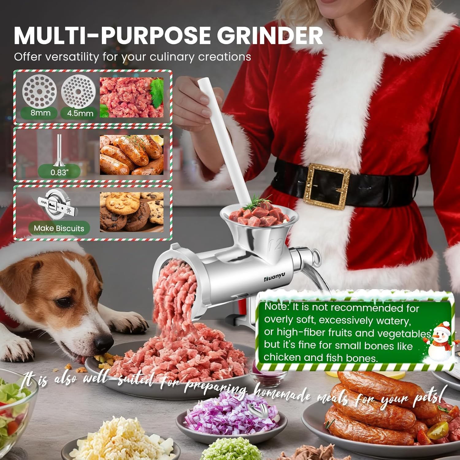 toacă diferite tipuri de carne: porc, vită, pește, pui (inclusiv oase mici/cartilaj moale)