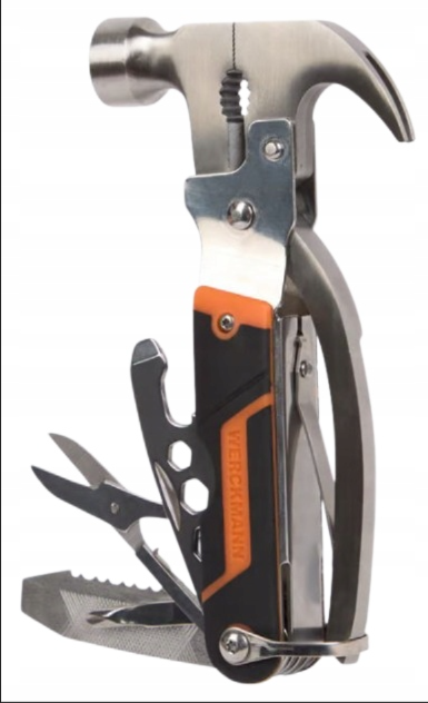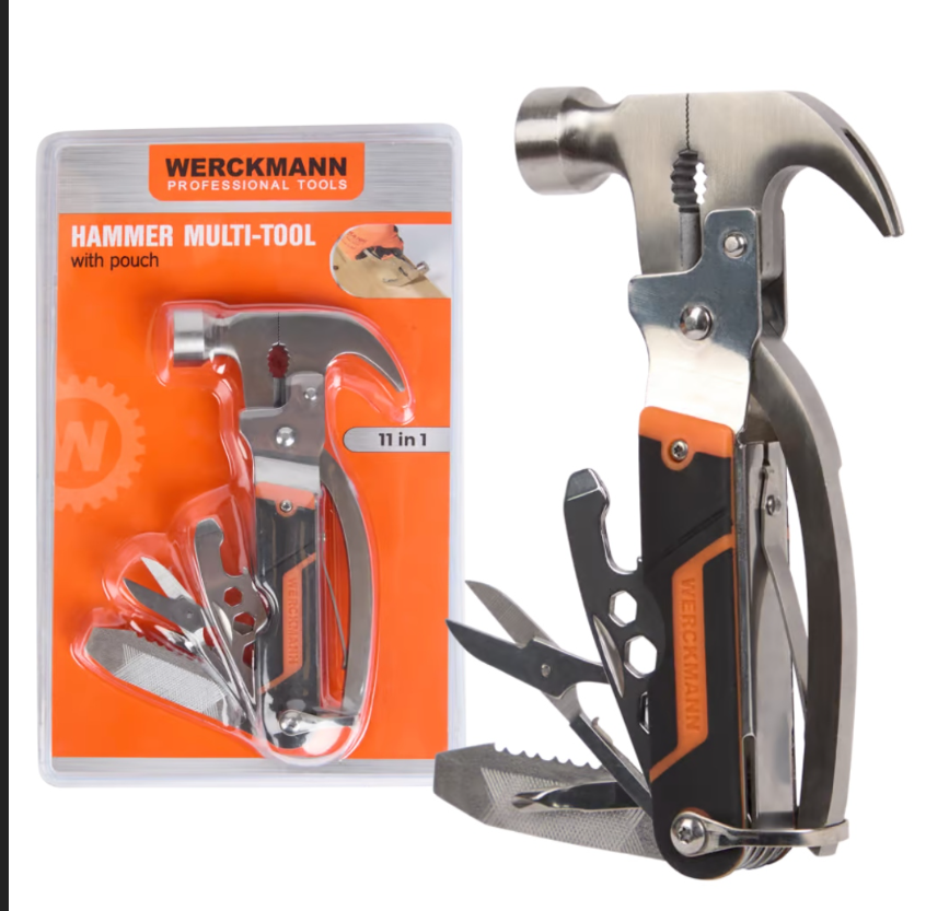 Werckmann – Ciocan multifuncțional 11 în 1, din oțel inoxidabil, pliabil, cu husă. Include funcții de clește, tăietor de sârmă, fierăstrău, șurubelnițe, pilă și chei fixe. Ideal pentru bricolaj, camping și urgențe.